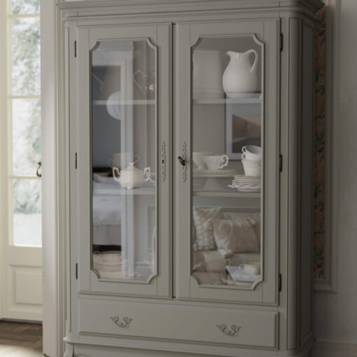 Garrat, møbelserie inspirert av den Georgianske perioden, her med et klassisk og stilrent vitrineskap i honningfarget bjørk, med skuffer for praktisk oppbevaring.